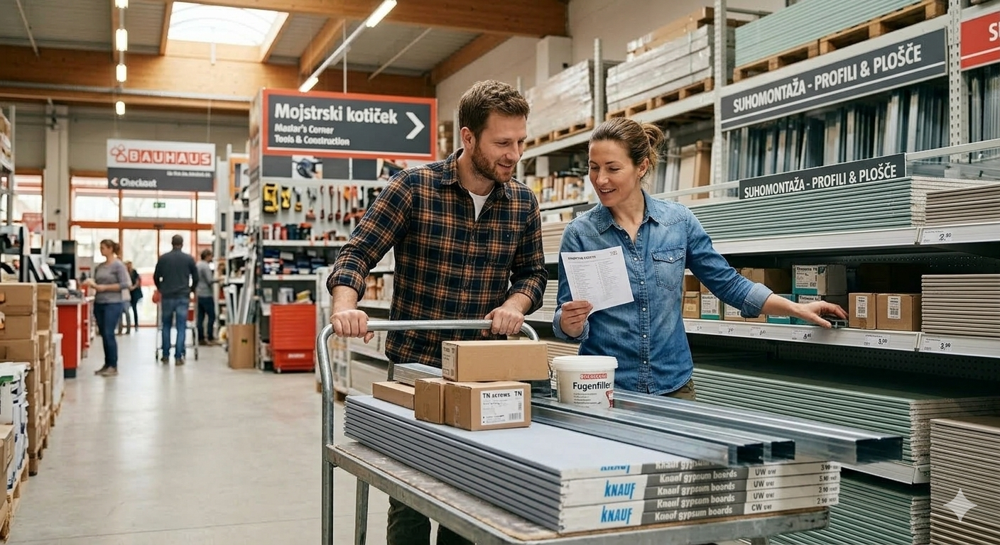Zdaj boste šli direktno v Bauhaus kot kralji. Nič ne iščite prodajalca pol ure, ampak vzemite voziček in naložite točno to, kar smo izračunali za našo steno mer 4 x 2,40 metra. Za ta primer bomo uporabili enojno oblogo (ena plošča na vsaki strani) brez izolacije, da osvojite osnove.